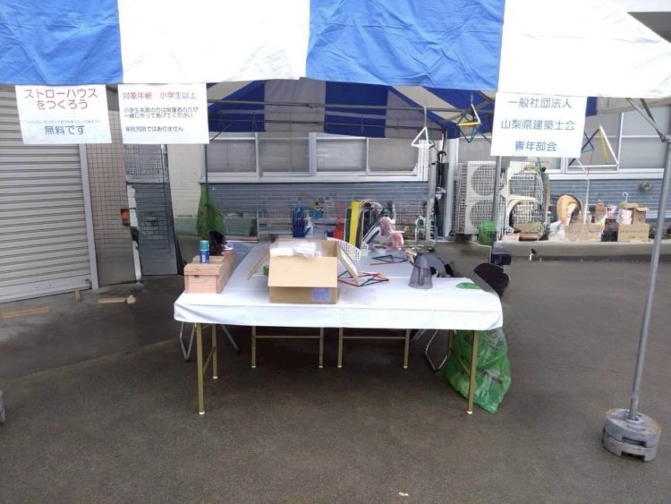 先日、地域のイベント「つる産業まつり」に、山梨県建築士会青年部会として参加し、「ストローハウスづくり」体験と「模擬建て方」を行いました。