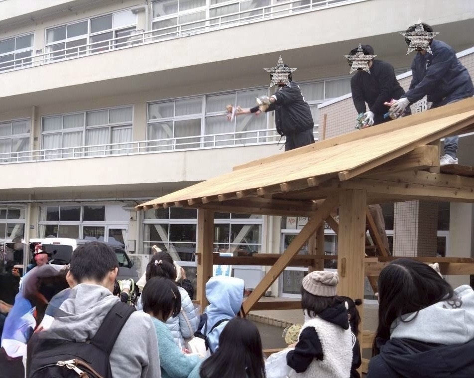 屋根の上からは、お菓子や小袋をまく「餅まき」風の体験もあり、大いに盛り上がりました。