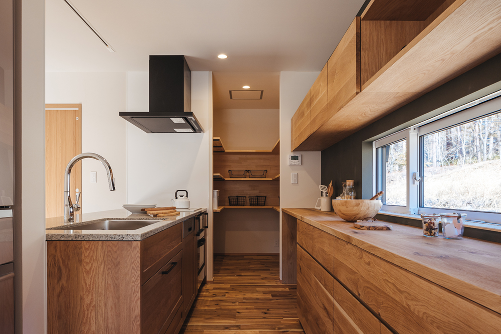 こだわりの造作キッチンは、落ち着いた木の雰囲気で。