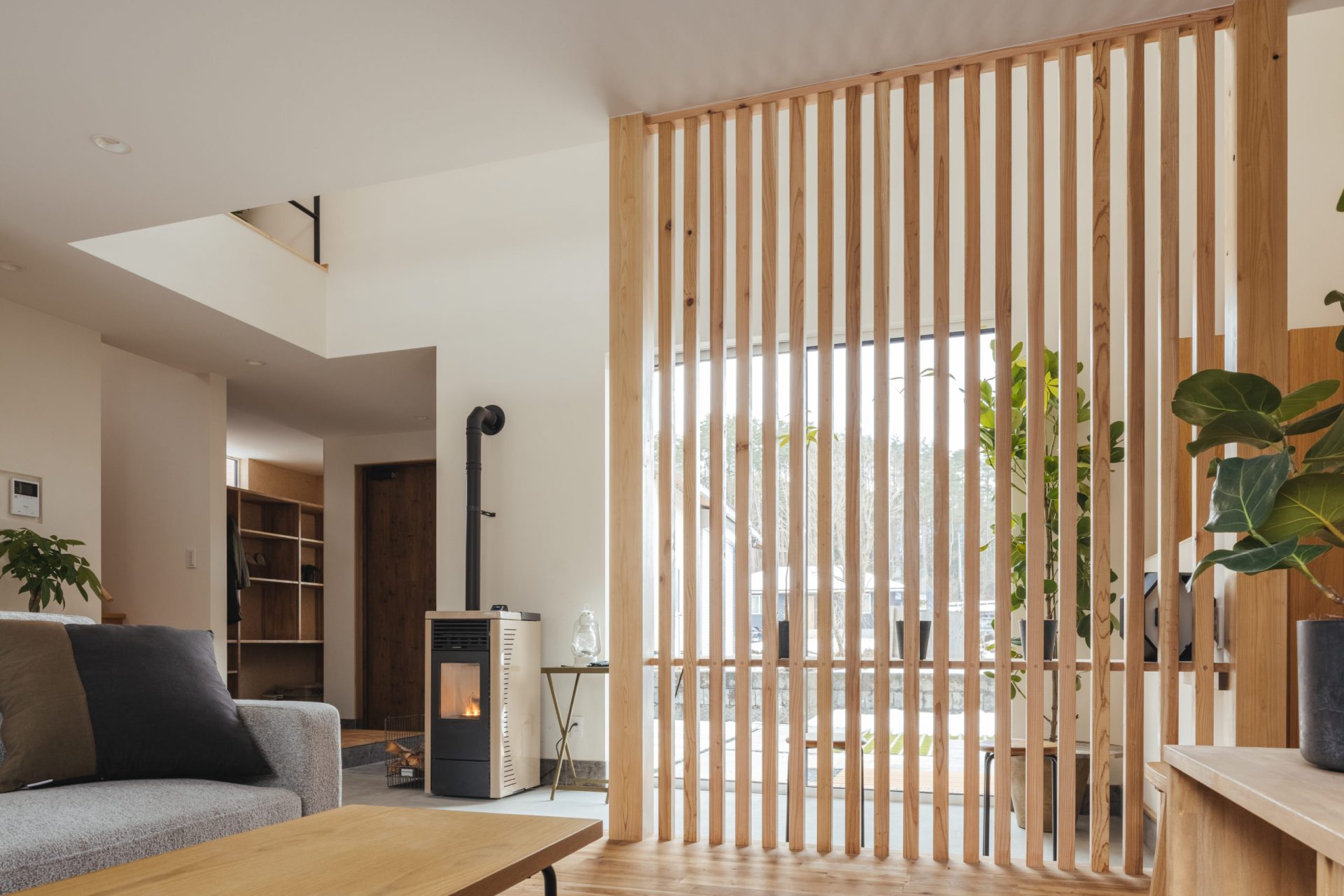 吹き抜けとペレットストーブで冬でも建物全体を暖かく保ちます。