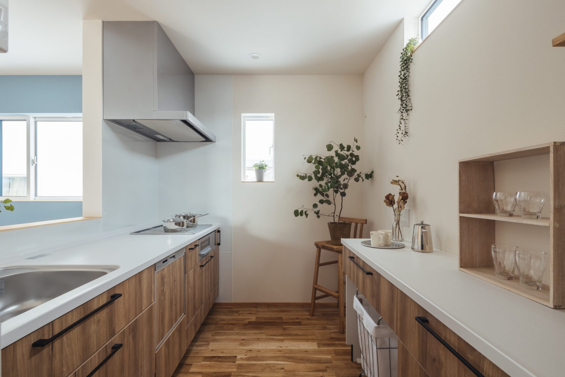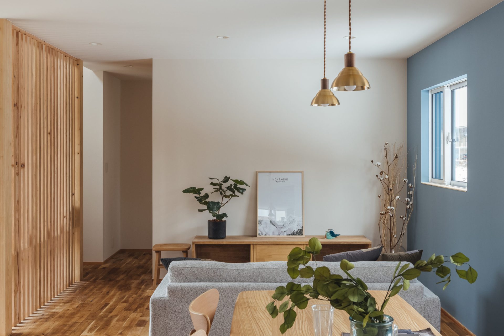 リビングの壁にはアクセントでブルーのペイントを。