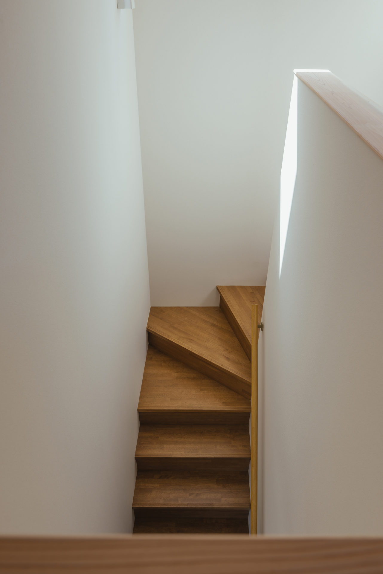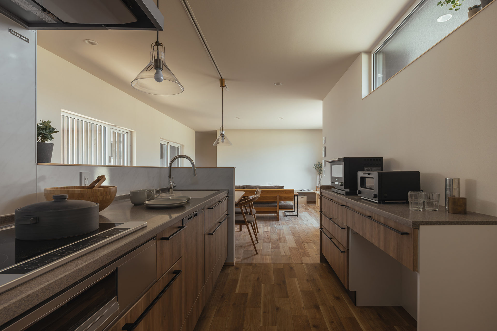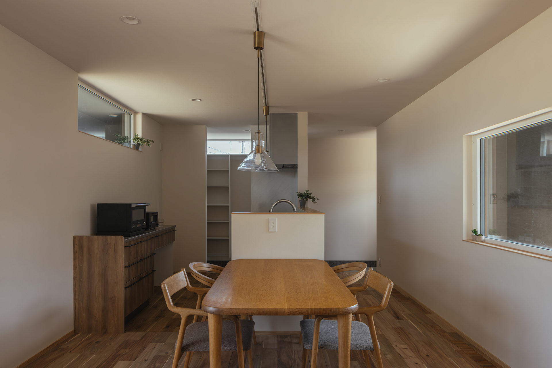 キッチンの窓はハイサイドにして、軒下に反射した関節光を取り入れてます。明るすぎず暗すぎない空間になるようにしました。