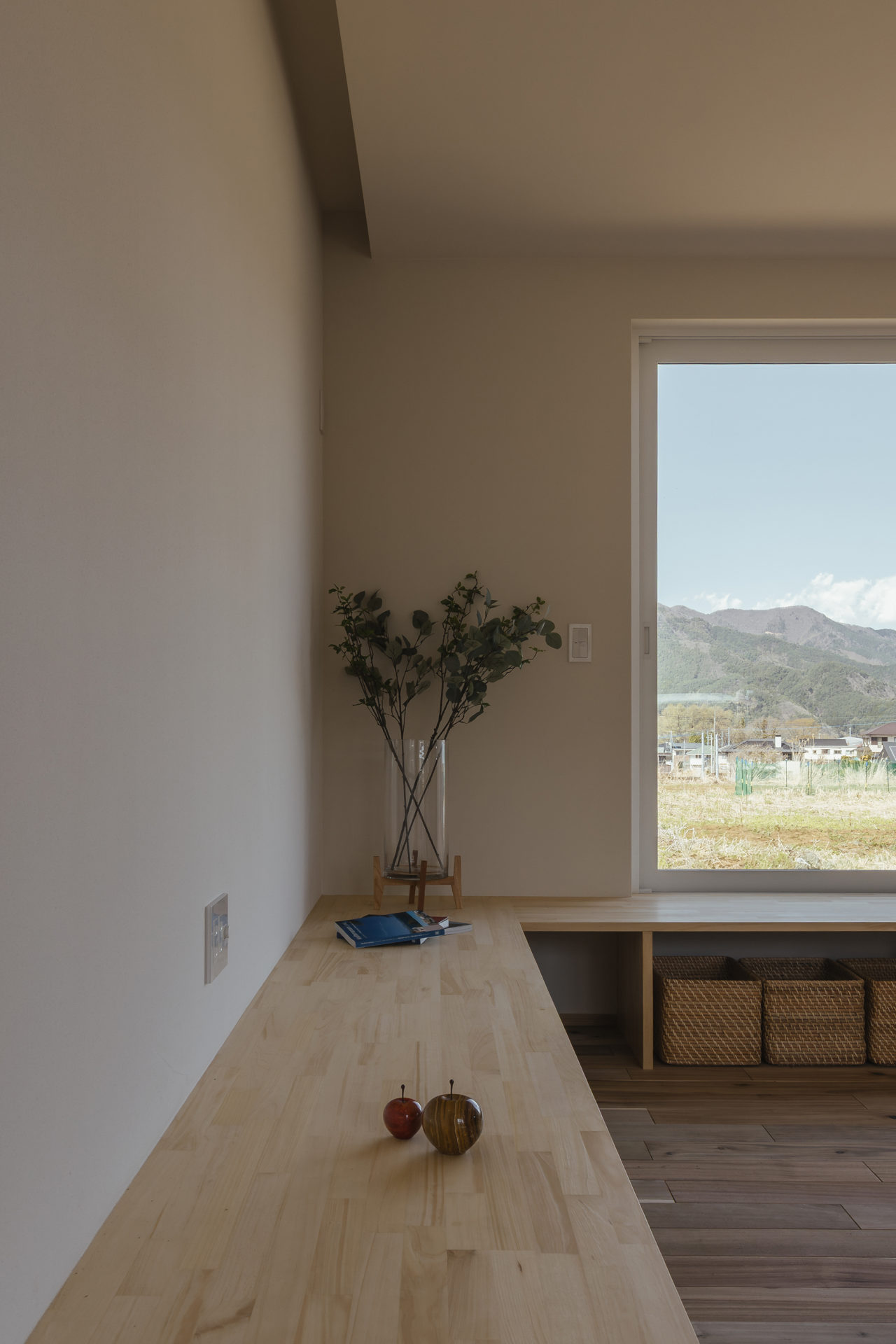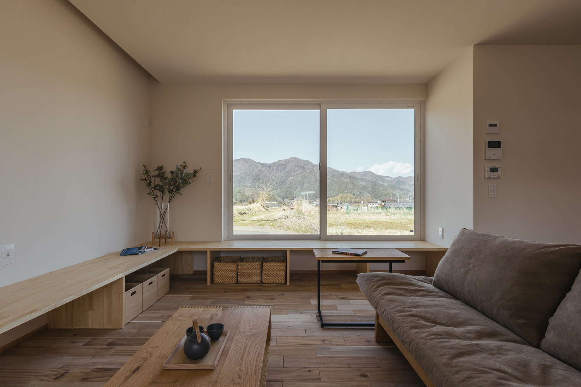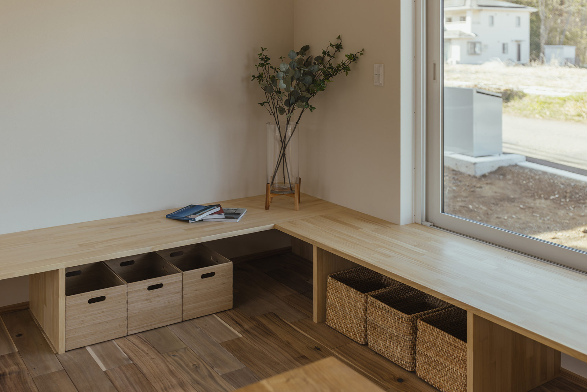TVボードとベンチが一体になった造作家具です。ベンチの高さに窓の下端を合わせ、すっきりとしたおさまりにしてます。