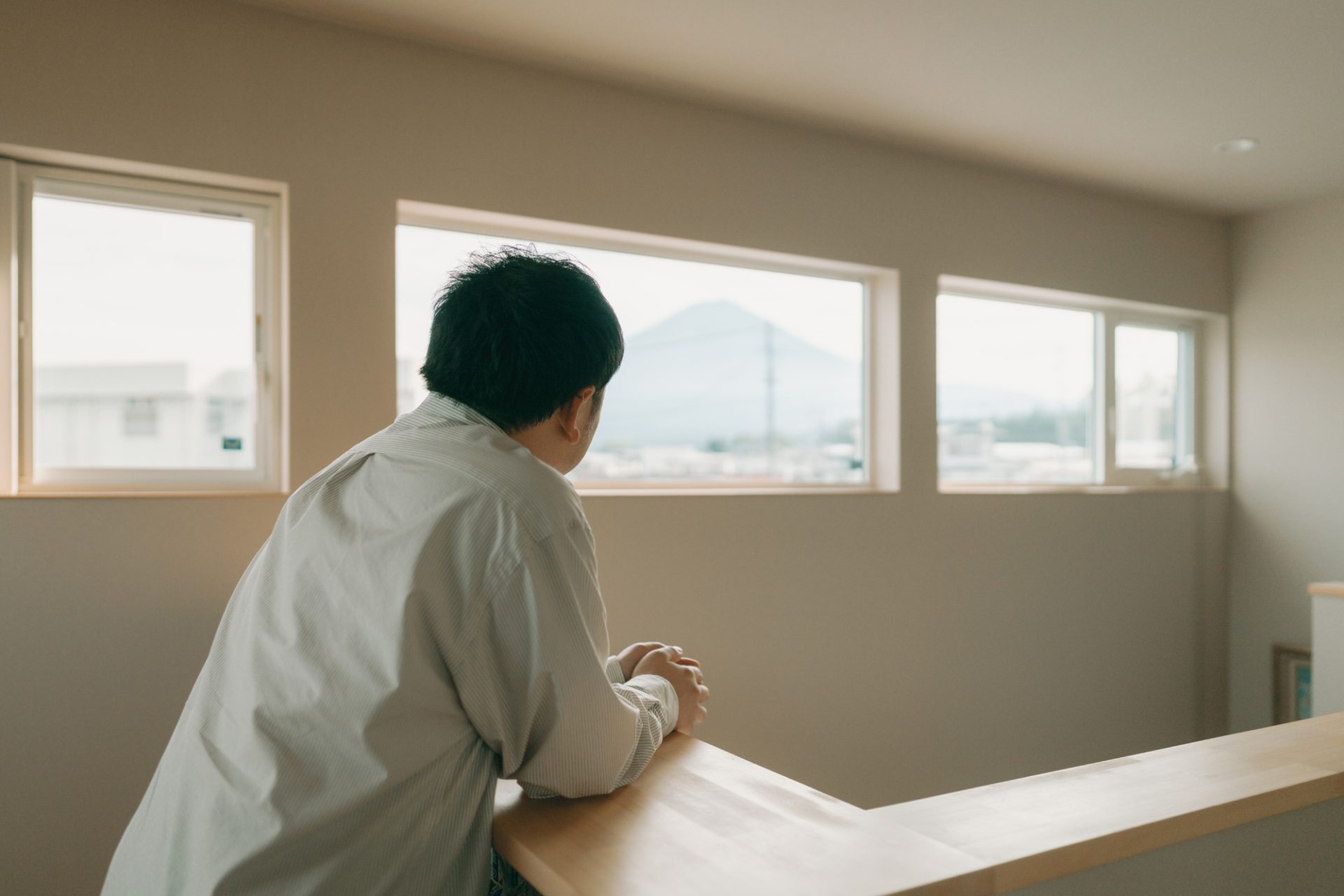 書斎から出ると廊下の窓からはしっかり富士山が見えます。山梨の、しかもこのエリアならではの贅沢な借景ですよね」